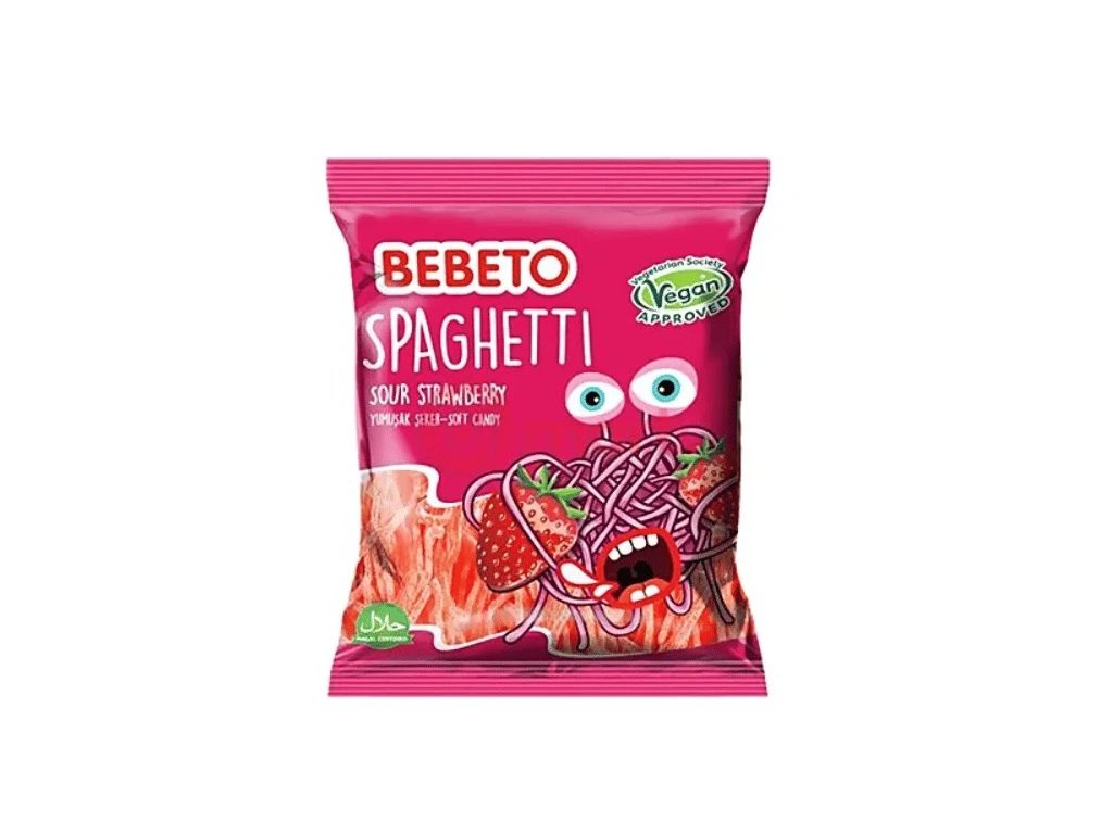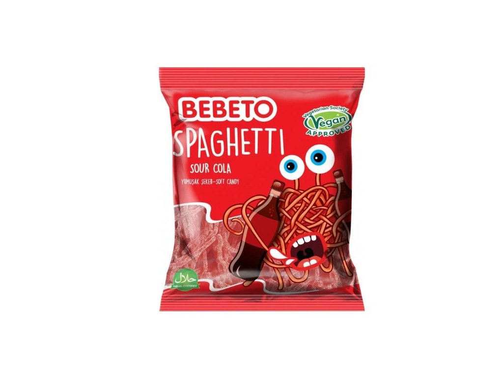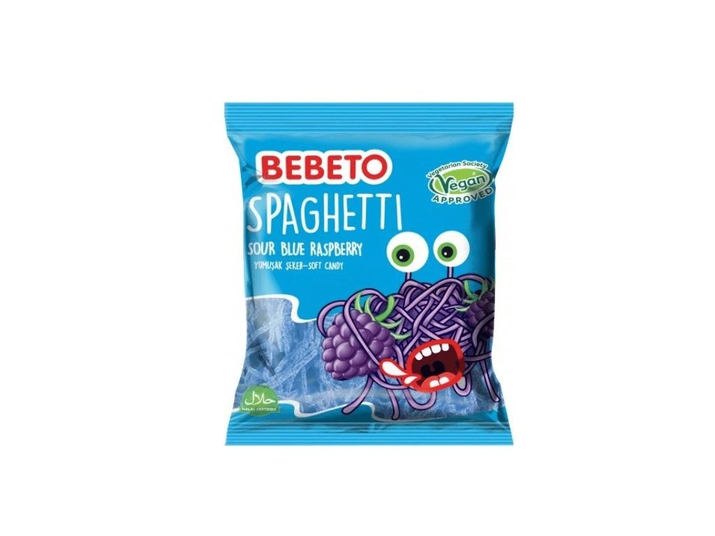 Objevte BEBETO želé 80 g Spaghetti Sour – kyselé želé špagety, které kombinují osvěžující ovocné příchutě modré maliny, jahody a coly.