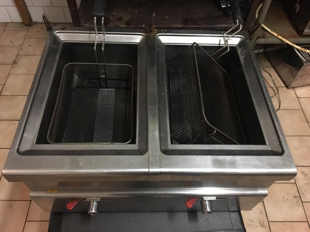 Použitá fritovací vana s přední výpustí na dva koše, které jsou součástí. Bez frité topných těles.