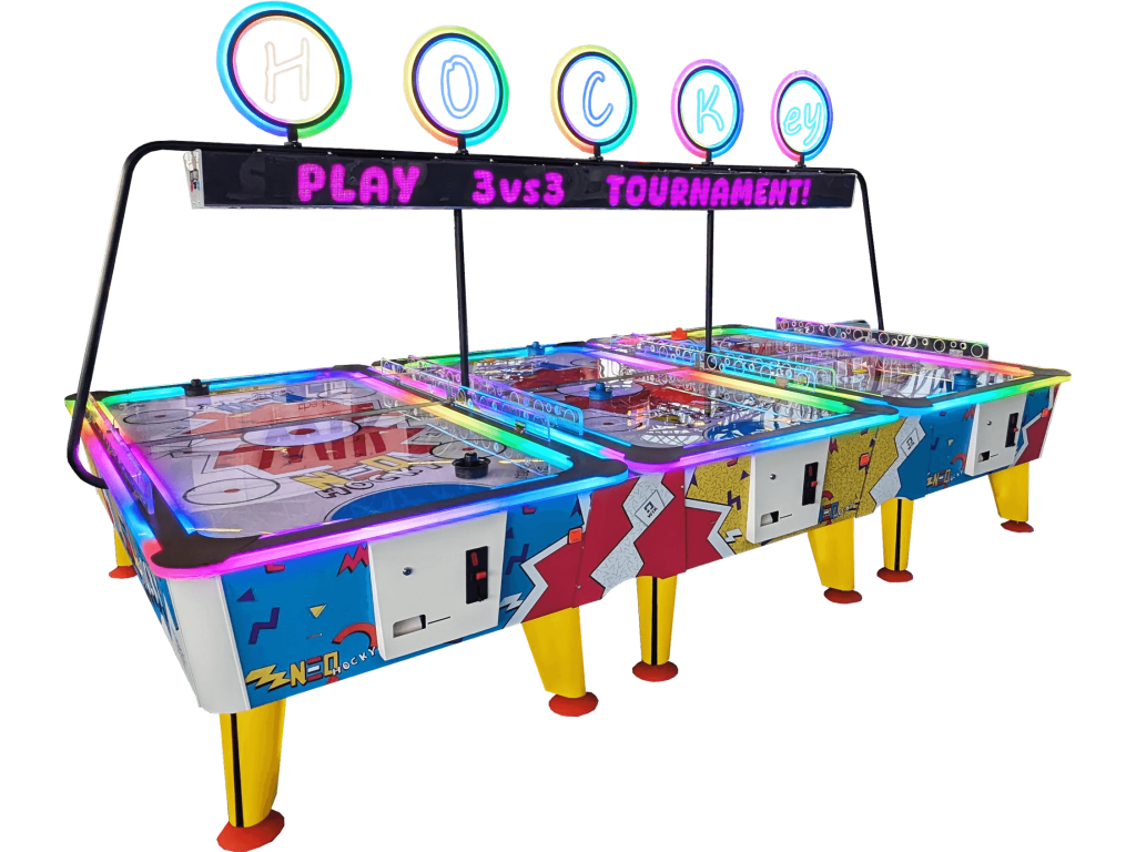 NEO Triple je ideální volbou pro provozy, které chtějí nabídnout moderní a atraktivní air hockey s vysokou herní kvalitou a výrazným designem, a zároveň umožnit hru většímu počtu hráčů najednou.