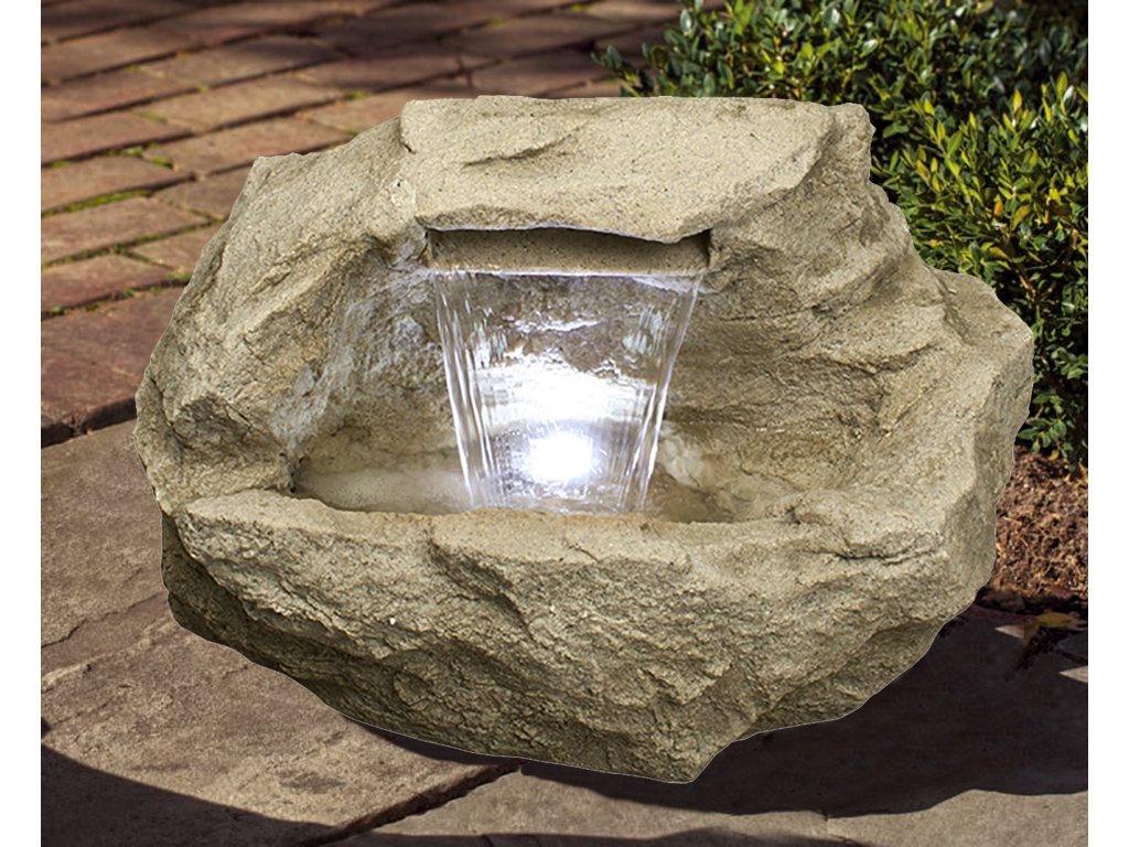 Tato krásně opracovaná Fontána z polyresinu, je věrnou imitací pískovcových skal. Její dominantou je široký otvor kterým vytéká proud vody na dno, kde je zadržováno v jezírku, které je osvětleno kruhovou výpustí s LED diodou po obvodu. Voda v této fontáně je přečerpávána čerpadlem v neustálém koloběhu a není proto potřeba mít k fontáně připojený přívod vody. Stačí jen jednou za čas doplnit vodu. Díky těmto malým rozměrům ji můžete využít i jako pítko pro vaše domácí mazlíčky (kočky a psy). Tato fontána je tak ideálním doplňkem jak do vašeho bytu, salónu nebo klidně zahrady.Součástí balení je vodní čerpadlo a elektrický adaptér pro napájení z elektrické sítě.