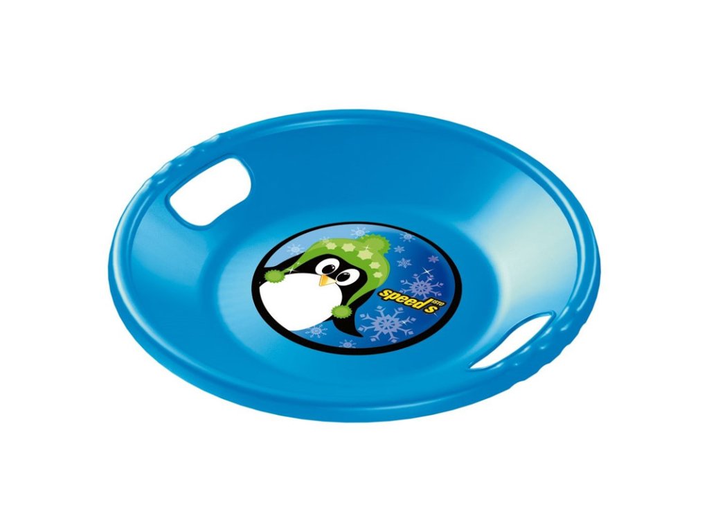 Kruhový talíř světle modré barvy na zimní radovánky s větší plochou. Tvarované úchyty po obvodu talíře umožňují bezpečný sjezd kopců a snadné manévrování. Vnitřek talíře je osazen barevnou ilustrací pro ještě větší atraktivitu. Děti si oblíbí tento kluzák na sníh. Vhodné pro děti od 3 let.- Průměr: 56 cm